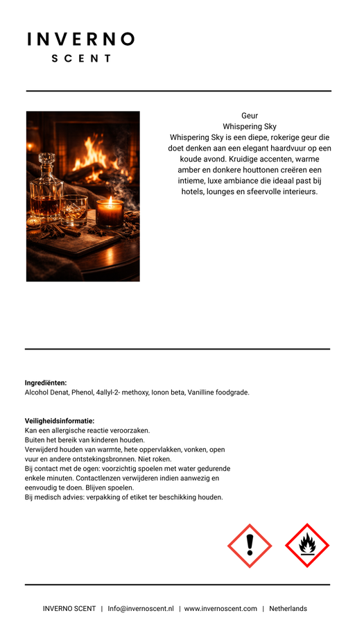 Inverno ScentOorspronkelijke prijs €34,95 - Oorspronkelijke prijs €34,95Oorspronkelijke prijs€34,95€34,95 - €34,95Huidige prijs €34,95| /Op voorraadWhispering Sky Een diepe, rokerige geur die doet denken aan een elegant haardvuur op een koude avond. Kruidige accenten, warme amber en donkere hou...